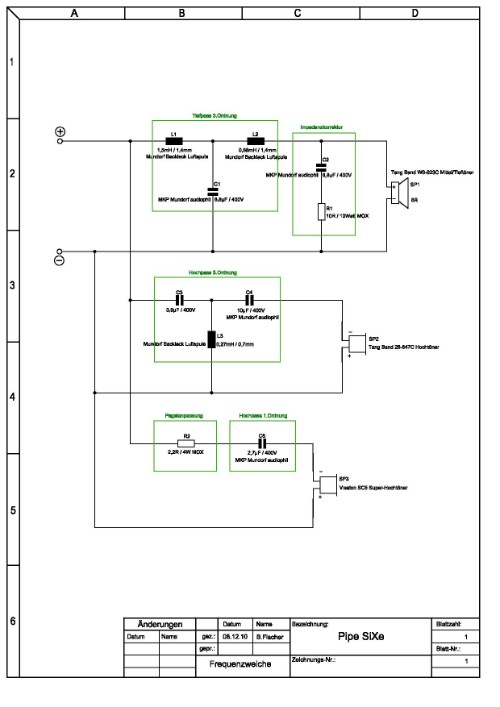 Die komplette Frequenzweiche der Pipe6e ist im Schaltplan „Frequenzweiche“ zu sehen. Für den Mittel/Tieftöner kommt ein Tiefpaß 3.Ordnung (18dB/Oktave) zur Anwendung, bestehend aus den Luftspulen L1=1,5mH, L2=0,68mH und dem Folienkondensator C1=6,8µF. Zusätzlich erhält der Woofer noch eine Frequenzgangkorrektur mit MOX-Widerstand R1=10 Ohm und dem Kondensator C2=6,8µF. Der Hochpaß schützt die Hochton-Kalotte vor Frequenzen unter 3,5 kHz, bestehend aus der Luftspule L3=0,27mH und den beiden Folienkondensatoren C3=3,9µF und C4=10µF. Der glatte Impedanzverlauf des Hochtöners benötigt keine zusätzliche Korrektur; auch eine Pegelanpassung ist nicht notwendig. Die beiden Lautsprecherchassis sind gegeneinander verpolt geschaltet.